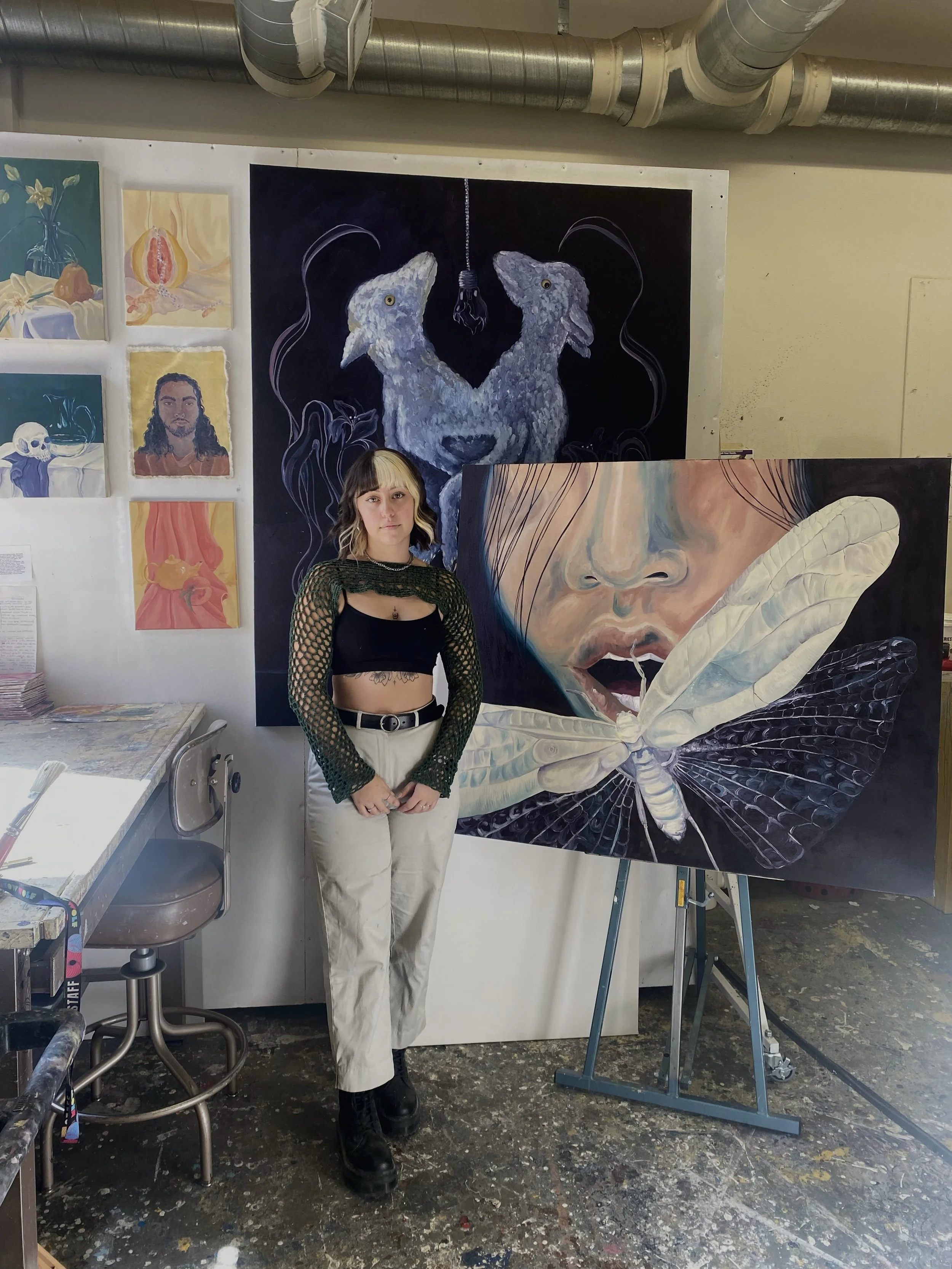 Maya Chacon born and raised in Veguita, New Mexico. As of today, she lives and works in Albuquerque, New Mexico. In December of 2023 Chacon graduated with a Bachelor in Fine Arts in Studio Art with a focus in painting and drawing from the University of New Mexico. Her work, which is primarily painting, focuses on trying to create a bridge between people. She strives to explore the intricate layers of emotions, thoughts, and experiences that make up the essence of who we are as individuals and as a collective. By bringing together abstract ideas and the human condition, her art seeks to evoke a sense of introspection, understanding, and connection